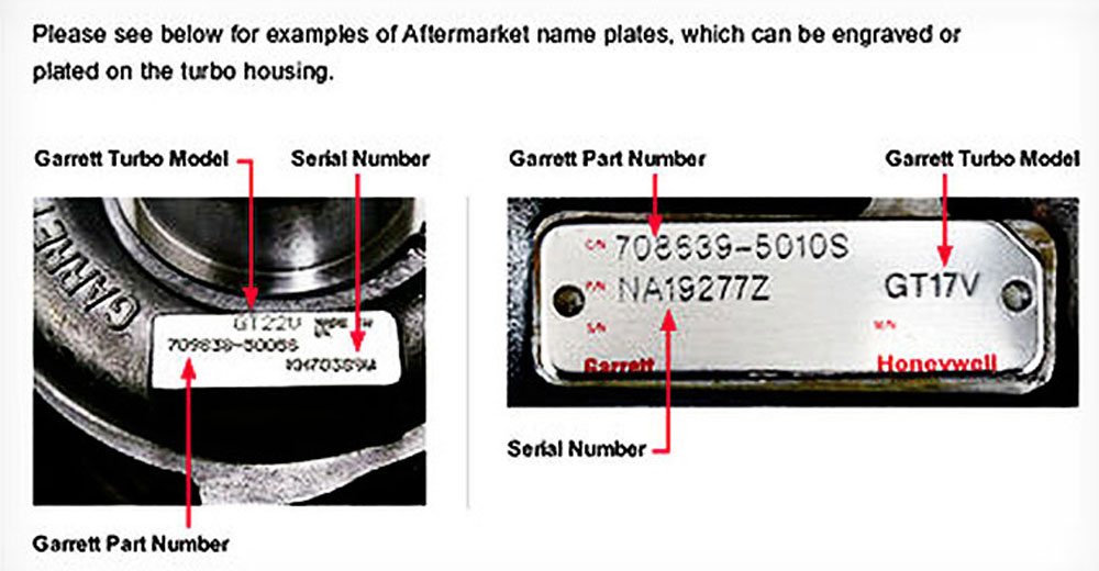 La manera de identificar correctamente el turbo es mediante la referencia del fabricante del turbo o del fabricante del coche. Puedes encontrar la referencia en una chapita en el exterior de la caracola. A continuación te mostramos algunas imágenes correspondientes a los principales fabricantes que te servirán de guía.